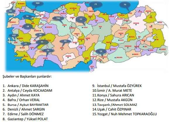 Türk Kütüphaneciler Derneği (TKD) 25. Dönem Genel Merkez Yönetim Kurulu Faaliyet Raporu (Ekim 2012-Ekim 2014)’na göre; TKD’nin ülke genelinde il ve ilçelerde 15 Şubesi bulunmakta olup, son iki yılda sekiz Şube (Çankırı, Diyarbakır, Gümüşhacıköy, Honaz, Isparta, Kırklareli, Kütahya, Sakarya) kapanmıştır. TKD Şubelerine kayıtlı toplam üye sayısı 1.675’dir..