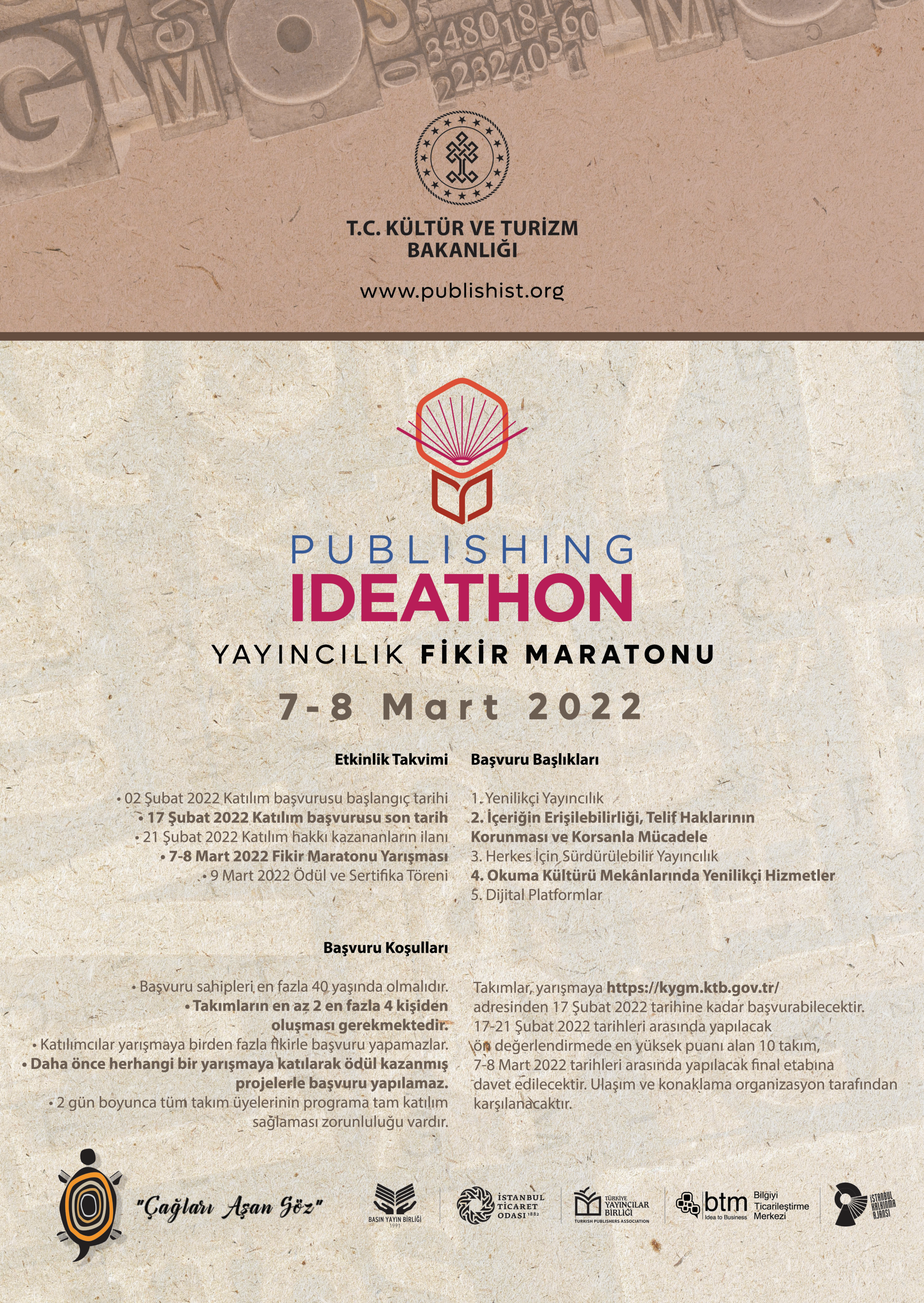 T.C. Kültür ve Turizm Bakanlığınca 7-8 Mart 2022 tarihinde İstanbul’da yayıncılık alanında bir fikir maratonu düzenlenecektir. Ulusal ve uluslararası ölçekte var olan dinamikler, her sektörde olduğu gibi kültür endüstrisinin en önemli başlıklarından biri olan yayıncılık sektörünü de etkilemektedir. Bu fikir maratonu ile ülkemizdeki yayıncılık sektörünün dayanıklılığını arttıracak, sürdürülebilirliğini destekleyecek, sektörün teknolojik gelişmelere adaptasyonunu sağlayacak, yeni teknolojik ürünler ve yenilikçi iş yaklaşımlarıyla yayıncılık sektörünün gelişimine katkıda bulunacak, vatandaşlarımızın yayıncılık sektörü ürünlerine erişimini kolaylaştıracak ve yaygınlaştıracak proje önerilerinin ortaya çıkarılması amaçlanmaktadır. (Afişi indirmek için tıklayınız.)